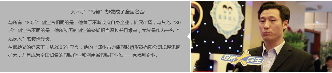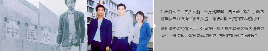 鄭州市力康假肢矯形器有限公司(簡稱力康),是一家專業從事假肢矯形器的設計、研發、制作及裝 配的專業機構。成立于1992年是河南省唯一一家福利企業。力康下設業務部、技術部、住院部、康復 部、售后服務部,并配有現代化的裝配車間和功能齊全的訓練大廳,為殘疾朋友康復訓練提供了可靠 保障??偨浝泶┐骷僦嗄辏兄S富的臨床經驗和親身體會;多年來,力康已為全國幾十萬名殘疾 朋友安裝上舒適、美觀、耐用的假肢和矯形器具,使他們更大限度地恢復了正常的工作和生活?!爱a 品即人品”的質量理念、先進的技術、實惠的價格、完善的售后服務是力康取勝的法寶……